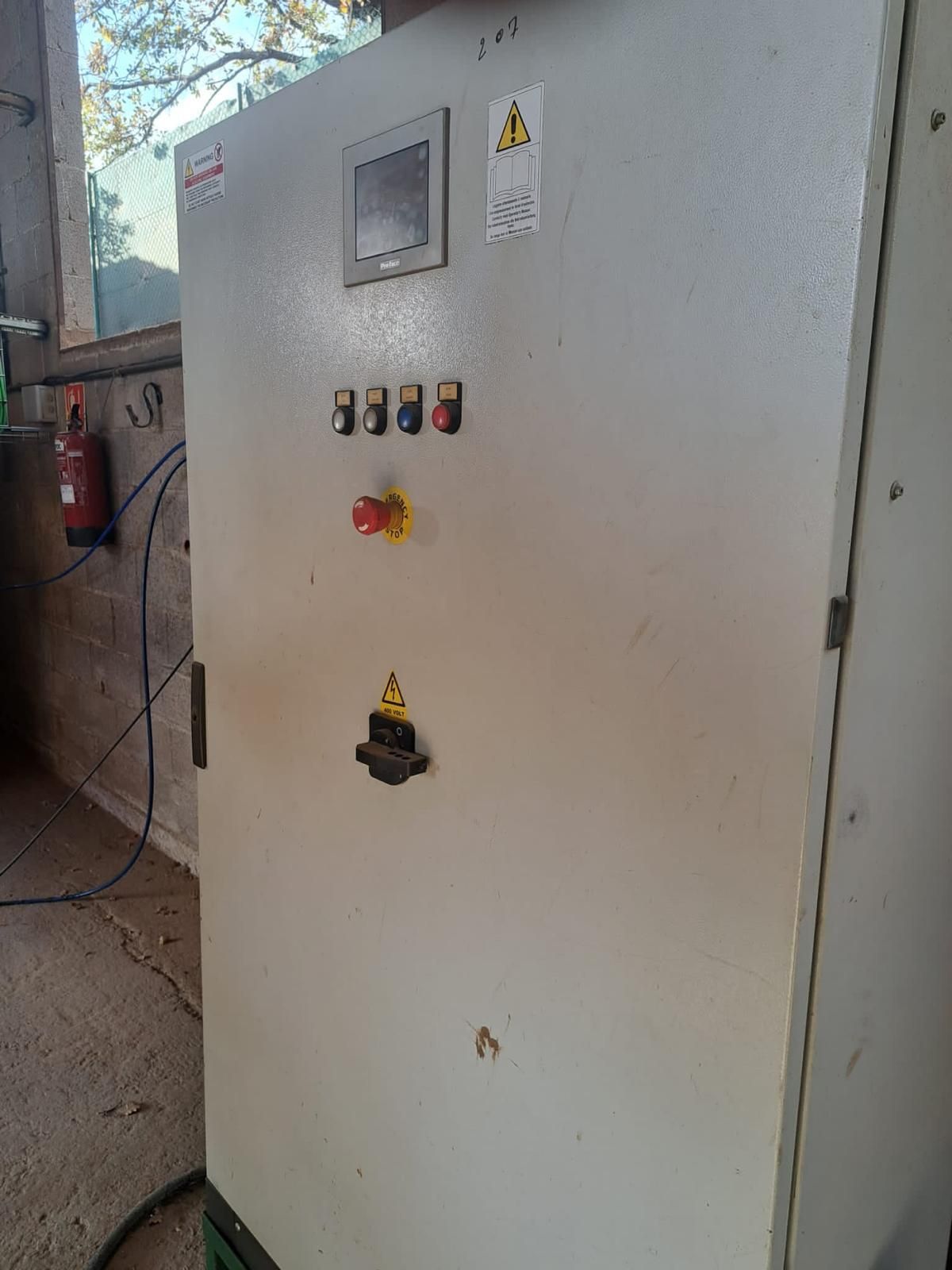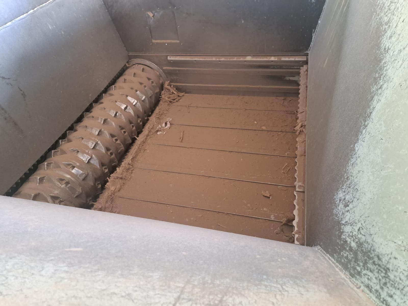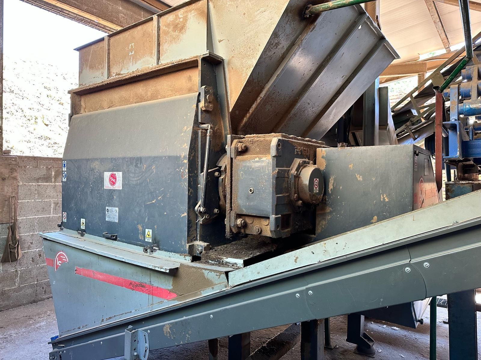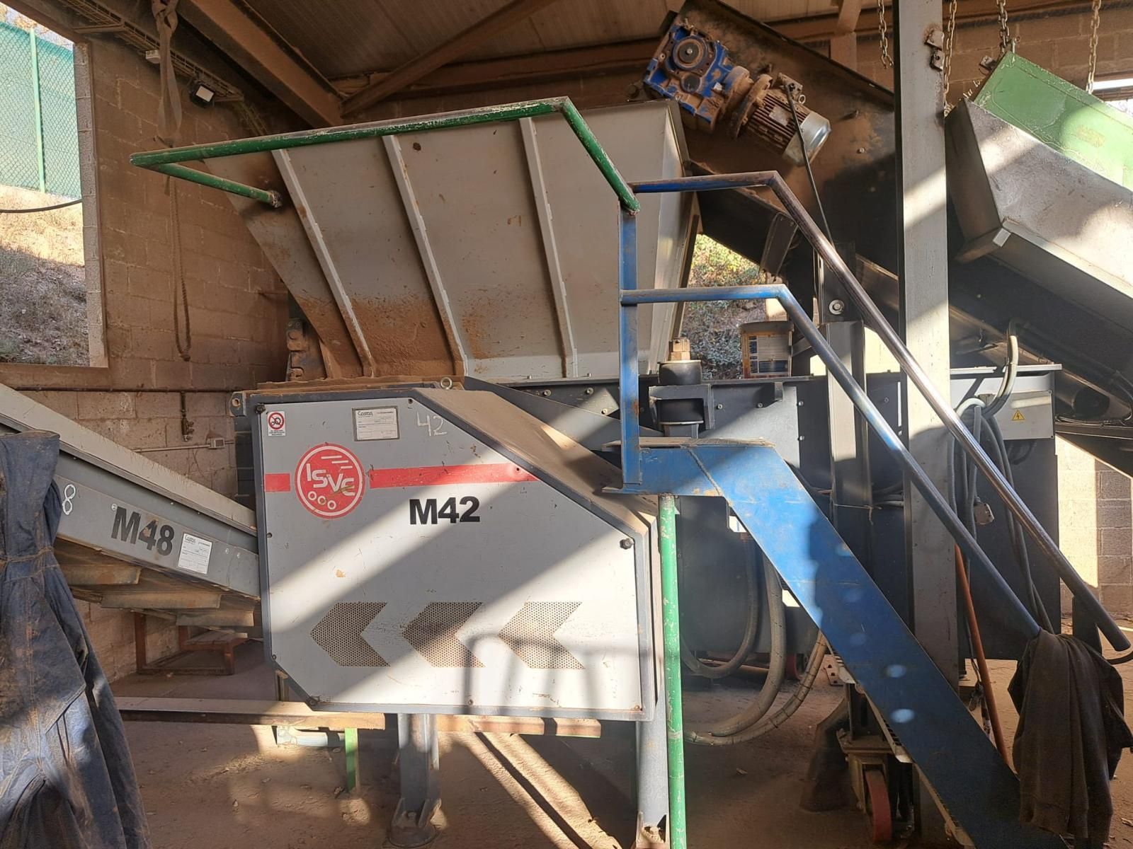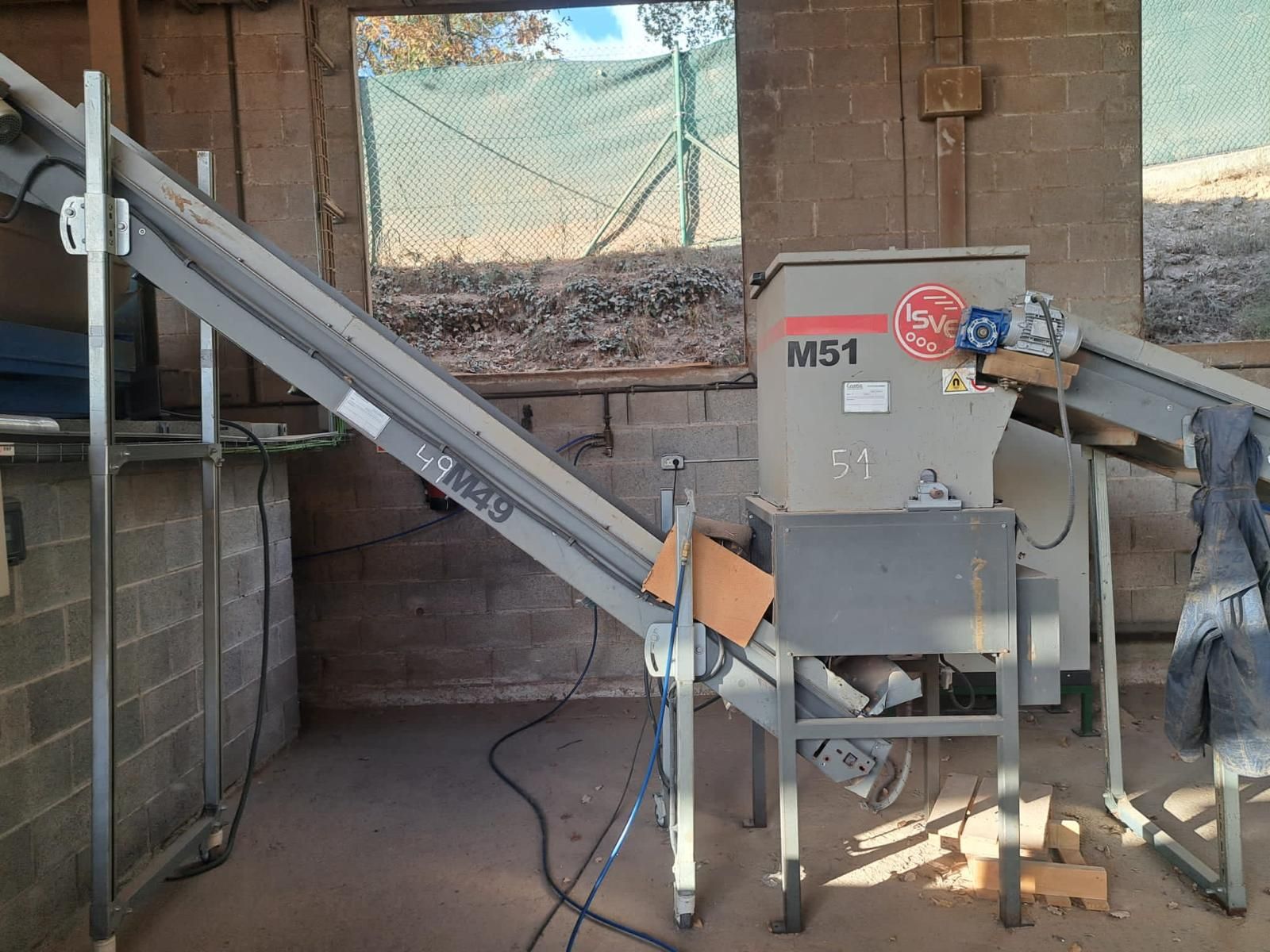 La línea se compone de cinta de entrada material, triturador, cinta de salida con detector de clavos y cuadro eléctrico PLC.