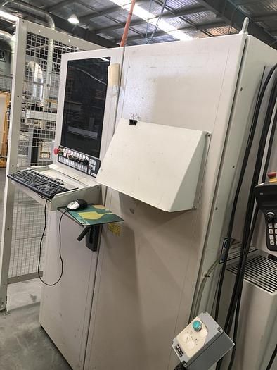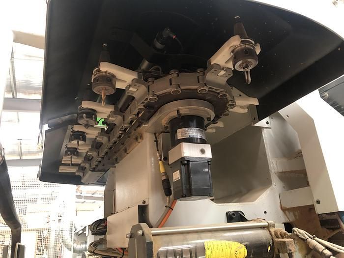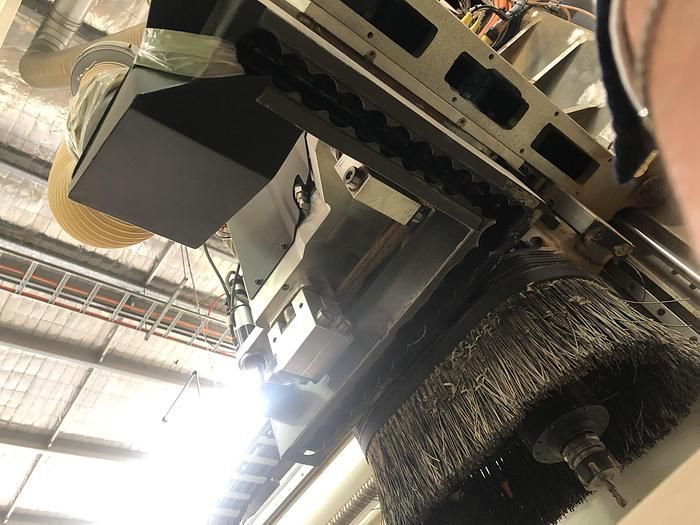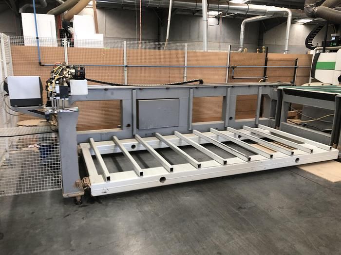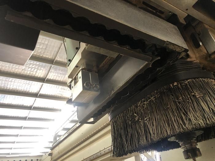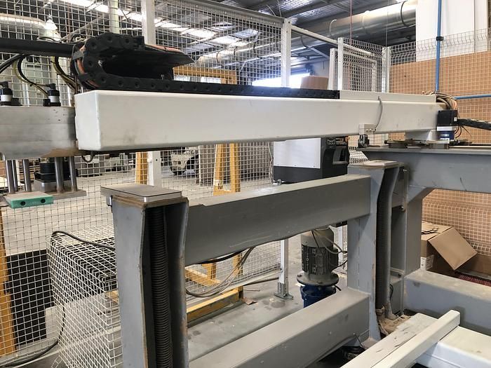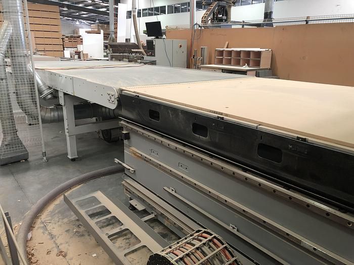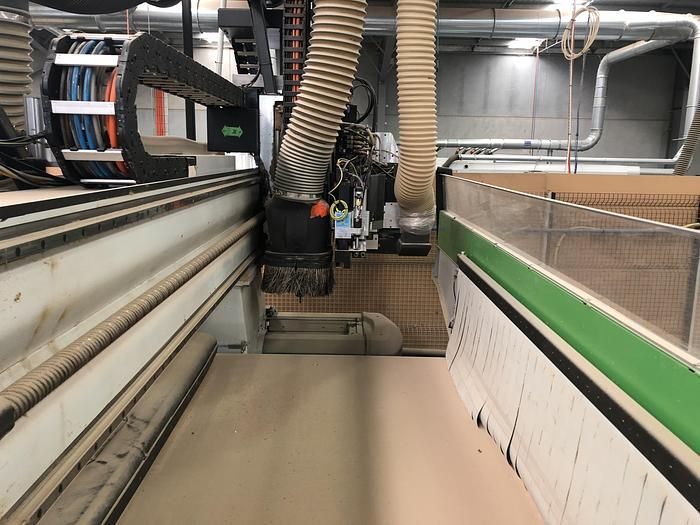Campo de trabajo en eje X 3875 mm Campo de trabajo en eje Y 1875 mm Carrera de trabajo en el eje Z 385 mm Mesa de trabajo de anidamiento completo Soplador para limpiar la superficie de trabajo Sistema de carga automático con mesa elevadora lateral Máquina etiquetadora Sistema automático de impresión y aplicación de etiquetas adhesivas N° 1 Electro mandril vertical de 3 ejes, con cambio automático de herramienta, refrigeración líquida, conos tipo Iso 30 Grupo de cuchillas Sistema de cambio de herramienta automático con 21 posiciones - ubicado en la parte trasera de la máquina Cabezal de perforación con 35 husillos dispuestos de la siguiente manera: - N° 17 verticales en eje X - N° 12 verticales en eje Y - N° 4 horizontal en eje X - N° 2 horizontal en eje Y Sistema de descarga automática con correa motorizada Sistema de protección y seguridad frontal con alfombras Sistema de lubricación automática Sistema de aire acondicionado para enfriar y limpiar el control de la máquina N° 2 bombas de vacío