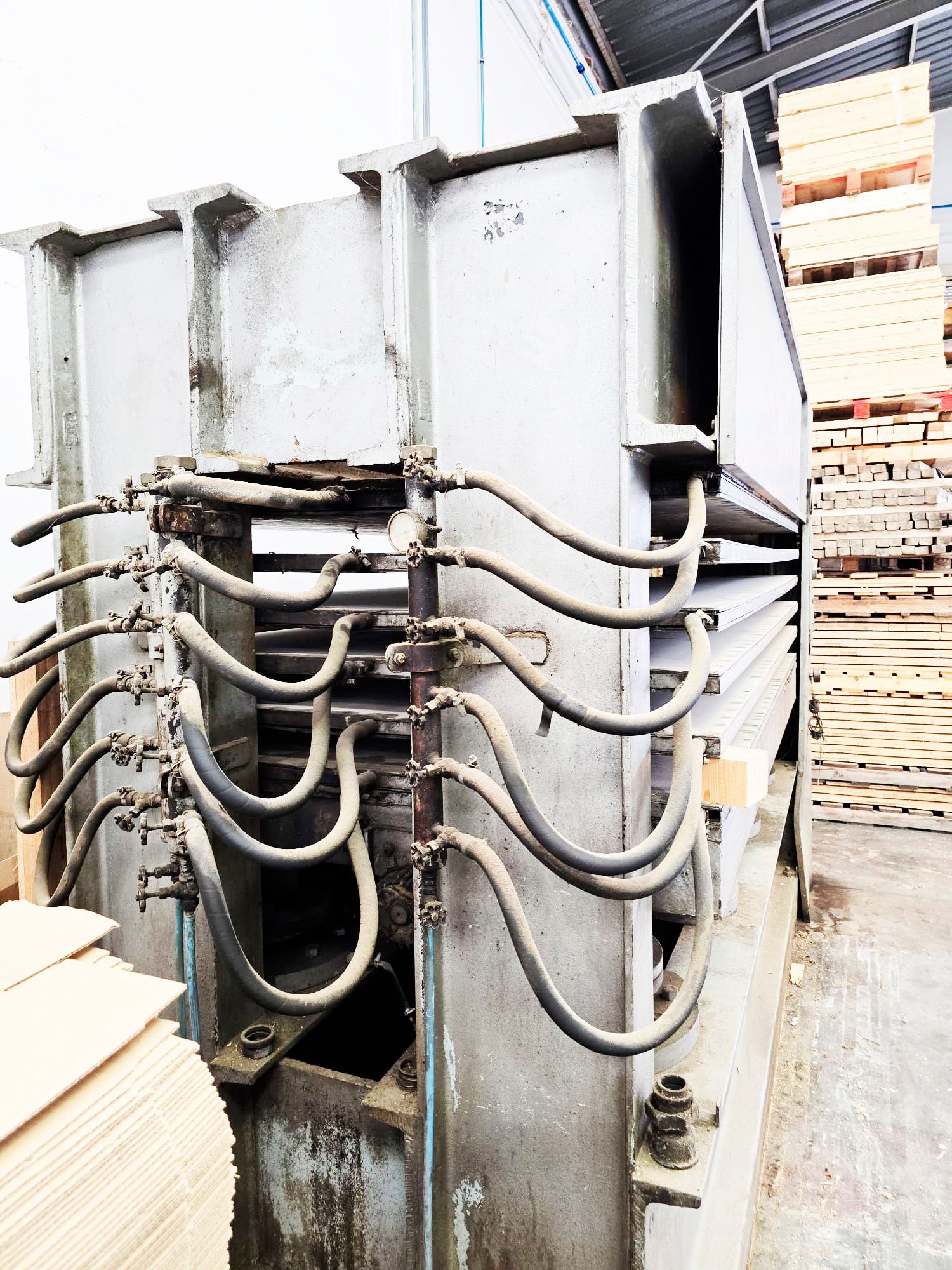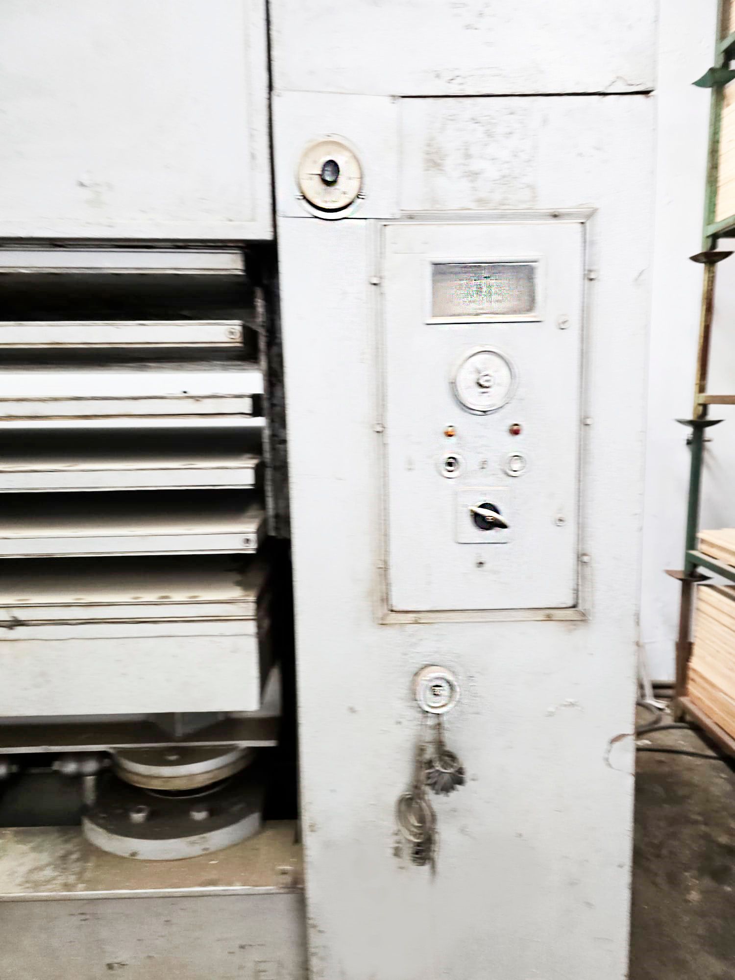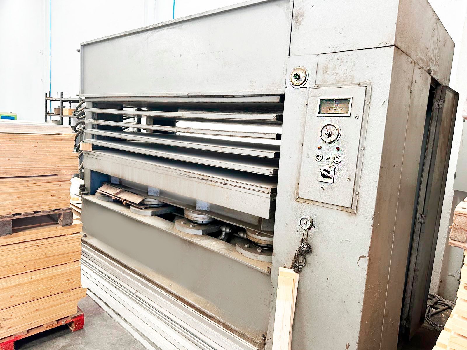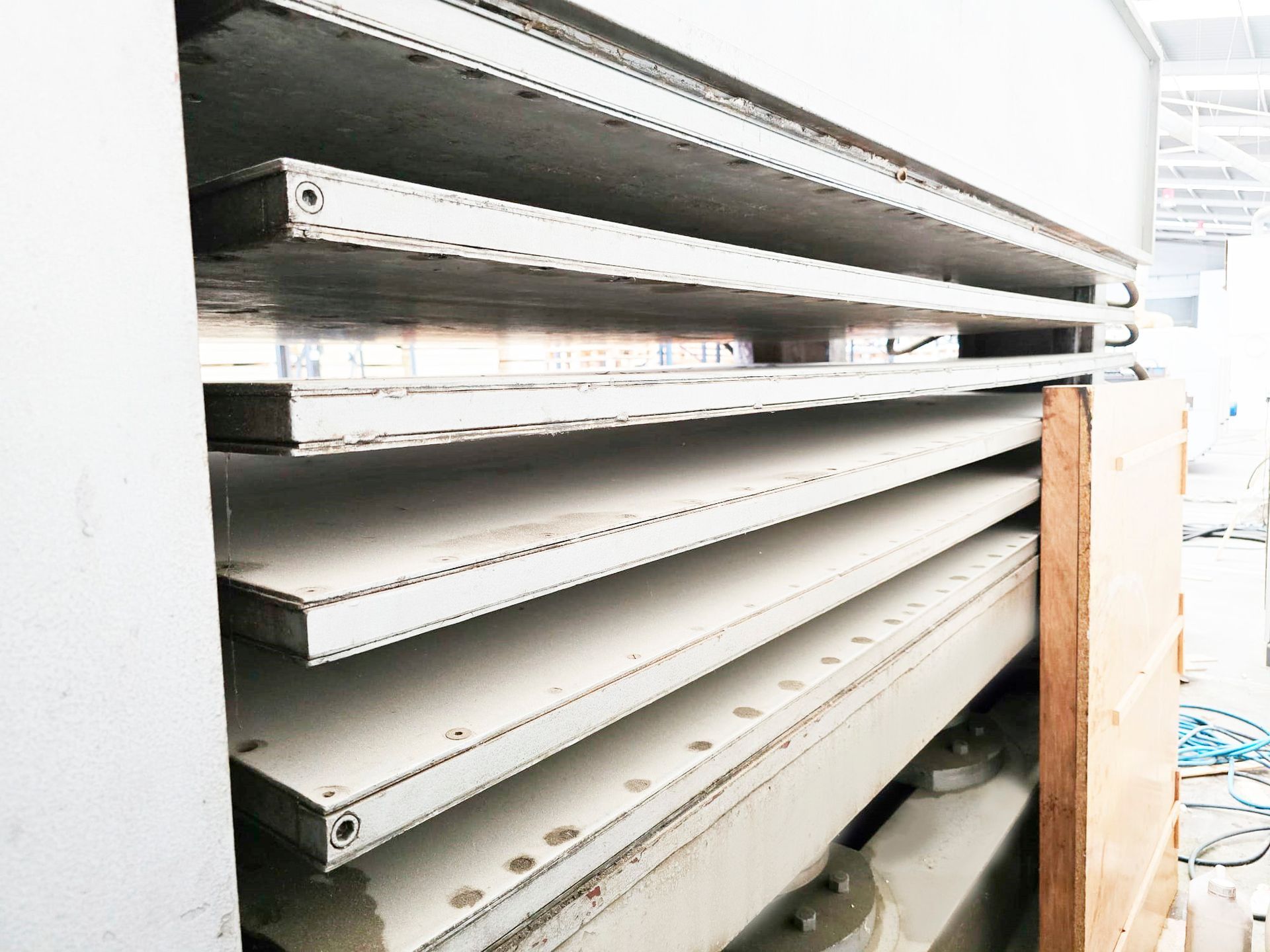 Platos calientes 6 - 5 huecos , capacidad de los platos 2500 x 1400 mm lleva 8 pistones de 180 mm c/u que le permite , Presión Max 9 Kg cm2 , perfecto estado , ajuste de los platos hidráulico ,medio de transmisión del calor : aceite térmico