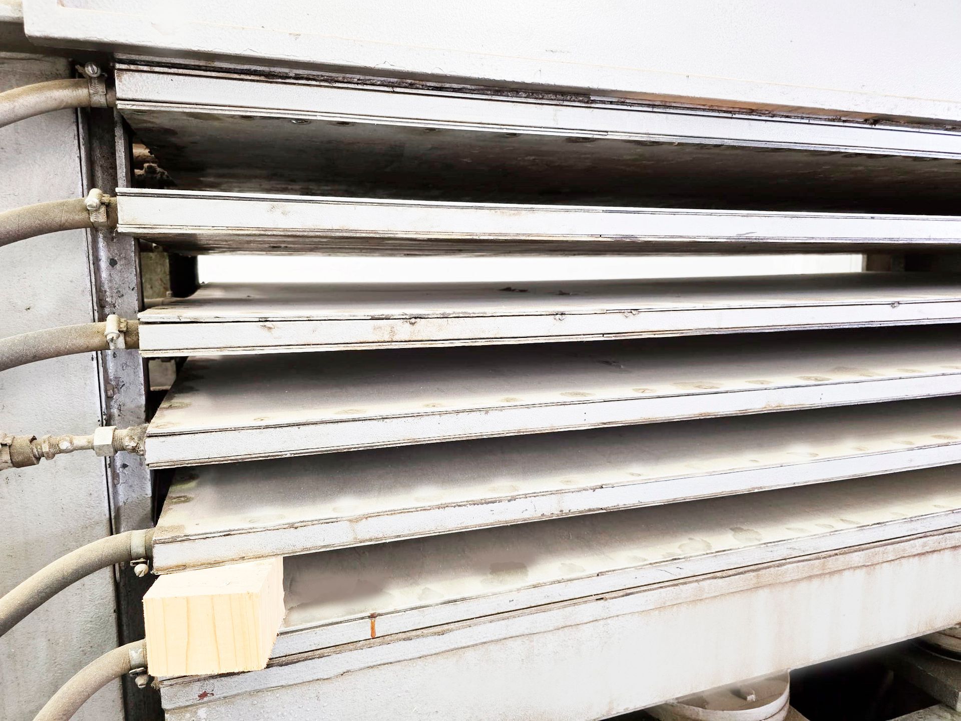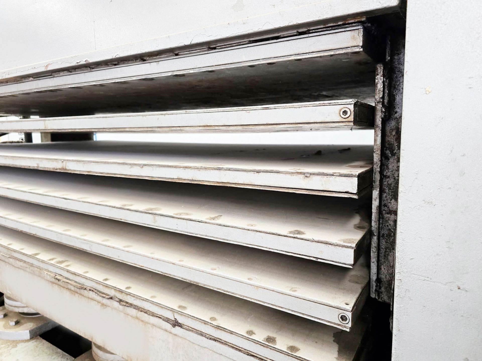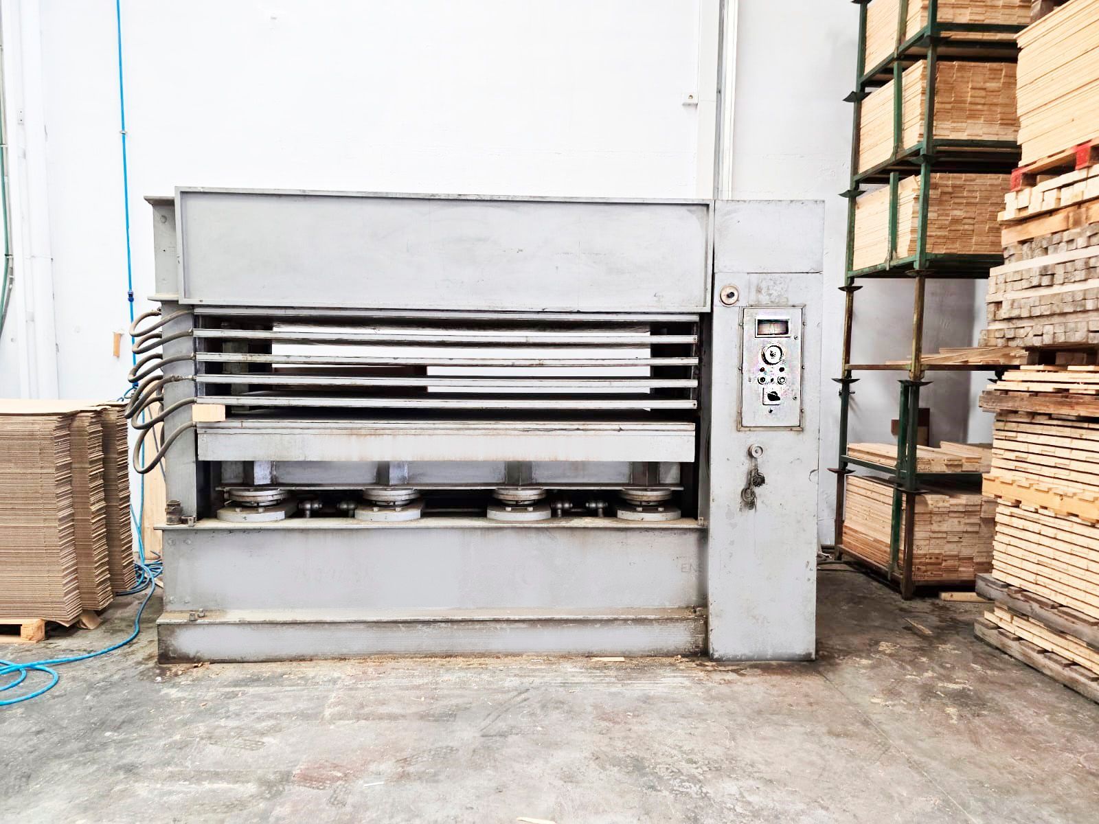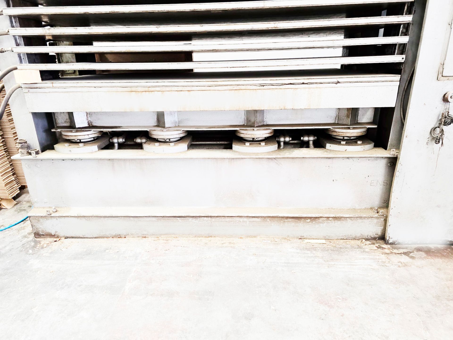 Platos calientes 6 - 5 huecos , capacidad de los platos 2500 x 1400 mm lleva 8 pistones de 180 mm c/u que le permite , Presión Max 9 Kg cm2 , perfecto estado , ajuste de los platos hidráulico ,medio de transmisión del calor : aceite térmico